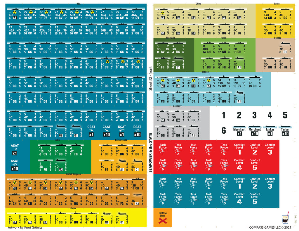Seapower & The State examines this worldwide state of naval affairs as related to major conflicts in a two-player simulation game of high complexity on the grand strategic scale for the time period from about 1984-1994. Detailed systems depict the capabilities and liabilities of the aircraft, surface warships, and submarines of the period as individual platform types and in combined mutual support teams in the light of the expressed naval doctrines of the time. The game system covers various levels of conflict ranging from crisis atmosphere maneuvering with no actual combat through mutual strategic nuclear warfare strikes, including such aspects as: