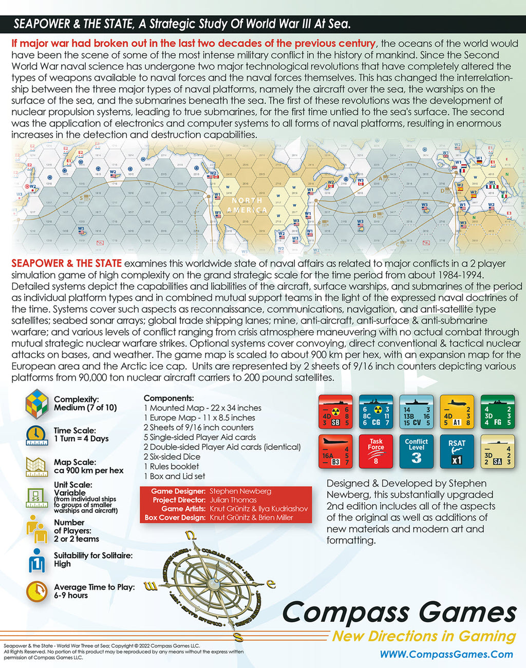 Optional systems cover convoying, direct conventional & tactical nuclear attacks on bases, and weather. The game map is scaled to about 900 km per hex, with an expansion map for the European area and the Arctic ice cap. Units are represented by two sheets of 9/16 inch counters depicting various platforms from 90,000 ton nuclear aircraft carriers to 200 pound satellites.