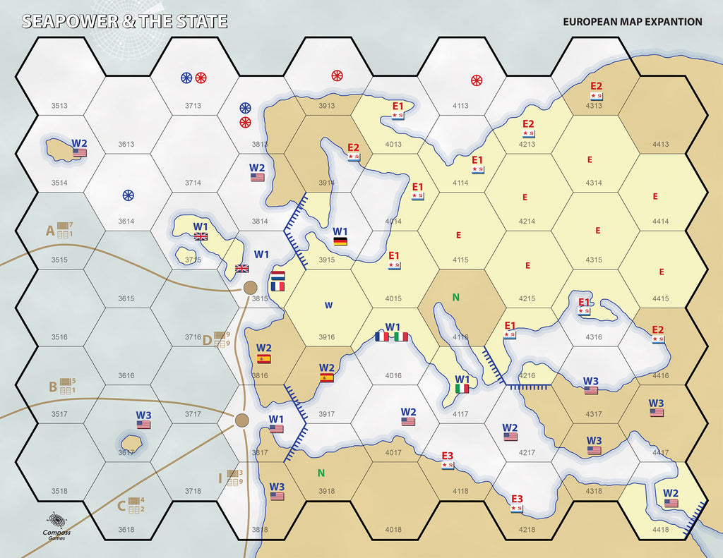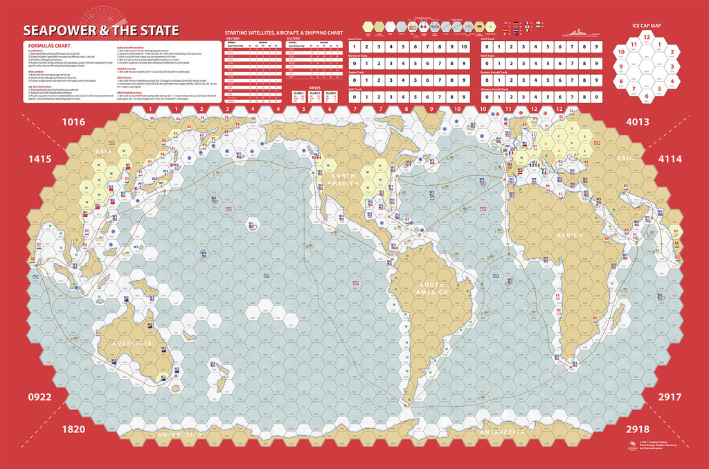 Seapower & The State is a strategic study of World War 3 at Sea. The game examines the worldwide state of naval affairs from 1984-1994 as related to major conflicts in this two-player simulation game of moderate complexity on the grand strategic scale. The viewpoint of the simulation is that of grand strategy and thus has the players acting as the overall commanders of the naval forces of the Eastern or Western alliances. Numerous scenarios are presented for various force levels for different time periods. Designed & developed by Stephen Newberg, this substantially upgraded 2nd edition includes all of the aspects of the original with more components and all-new artwork.