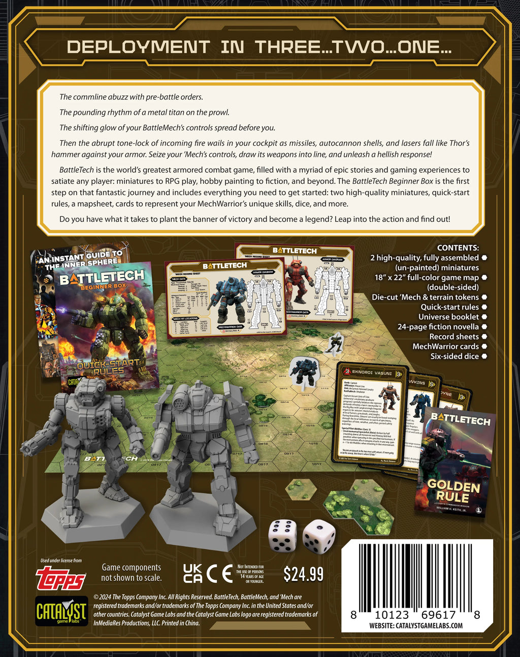 BattleTech is the world's greatest armored combat game, filled with epic stories and gaming experiences to satiate any player: miniatures to RPG play, hobby painting to fiction, and beyond. The BattleTech Beginner Box is the first step on that fantastic journey and includes everything you need to get started: two high-quality miniatures, quick-start rules, a mapsheet, cards to represent your MechWarrior's unique skills, dice, and more.