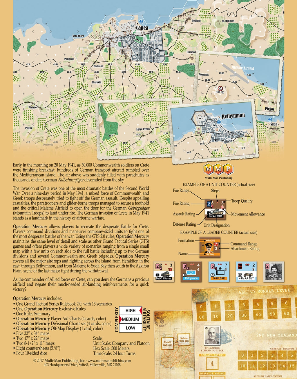 OPERATION MERCURY maintains the same level of detail and scale as other Grand Tactical Series (GTS) games. Players command divisions and maneuver company-sized units to fight one of the most desperate battles of the war. Using the GTS 2.0 rules, OPERATION MERCURY offers two players or teams a wide range of scenarios ranging from a single small map with a few units on each side to the full battle including up to two German divisions and several Commonwealth and Greek brigades. OPERATION MERCURY covers all the major airdrops and fighting across the island from Heraklion in the east, through Rethymnon, and from Maleme to Suda Bay then south to the Askifou Plain, scene of the last major fight during the withdrawal.