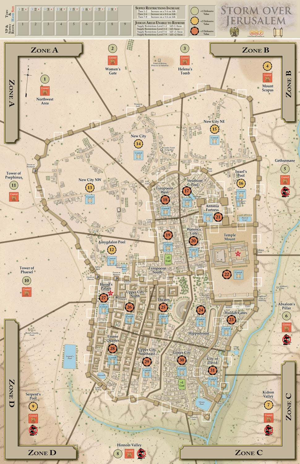 Storm Over Jerusalem is a card-assisted, area-movement game based on Multi-Man Publishing’s Storm Over series of games (Storm Over Stalingrad, Storm Over Dien Bien Phu, and Storm Over Normandy). Cards augment the game play and increase the tensions and choices faced by each player.