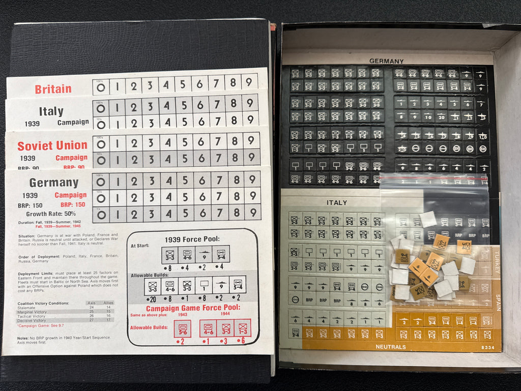 "Rise and Decline of the Third Reich" is a realistic wargame simulation of the strategic situation as it existed in Europe during WWII. It features 6 wargames in 1; a campaign game of 24 turns which runs from the invasion of Poland to Germany's final defeat or victory, an advanced game providing additional complexity, a multi-player version (in which even the Italian player can be the winner), and three 12-turn scenarios which allow you to play faster games. Third Reich is not for the faint of heart or the beginner simulation gamer. For 2 to 6 players. 560 counters which includes 1 blank one