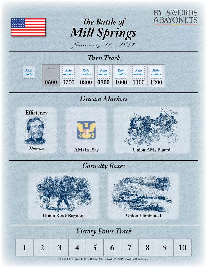 By Swords and Bayonets is a two-player, regimental level wargame and the ninth installment in the award-winning Great Battles of the American Civil War series. Its focus is on small(er)-scale battles of the ACW and will serve as an ideal introduction for players new to the series. By reducing the size of the contending forces, players can more easily learn the detailed, layered rules and subsystems of the GBACW series without fear of being overwhelmed by the size of the battles themselves.