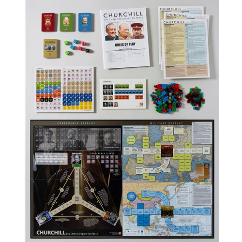 By late 1942 the Axis had been stopped at Stalingrad, El Alamein, and Guadalcanal. With Axis expansion halted and Allied victory only a matter of time and resources Churchill, Roosevelt, and Stalin began to focus on how to shape the ensuing peace to their advantage. Churchill is a game about the inter-Allied conflicts that occurred over the Conference table as each side vies to control the Allied agenda and the course of things to come.