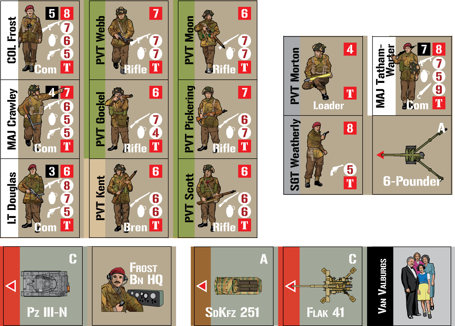 Combat! Is a solitaire game of man-to-man combat in World War Two. This is the third game in the series of Combat! games that use the same system. This game introduces the British Armed Forces into the system. The game will focus on one of the most well-told moments in the long history of Britain. The fight for Arnhem Bridge. Players will use the actual British army forces that fought at the famed bridge and most hold at all costs.