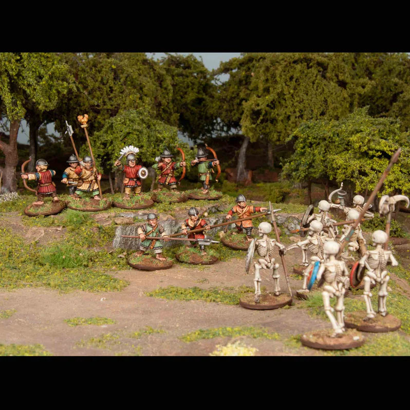 This hard plastic set allows you to build up to 24 legionaries with spatha, spear, and plumbata along with two types of standards and full command. This set provides three different helmet options: the Niedebieber, ridge, and Spangenhelm styles along with the fur “Panonnian” cap. There are two types of crest options and extra heads to create command. This set can also be used to create armored warriors for many Dark Age armies including Goths, Burgundians, Saxons, Franks, and the Romano-British among others.