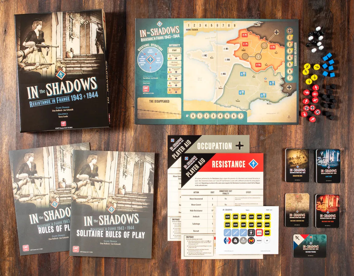 In the Shadows is a two-player card-driven game about the desperate struggle of the French Resistance against the occupying Nazi and collaborating French forces between January 1943 and June 1944. In the game you will play as either the Resistance or the Occupation in a fight over the hearts and minds of the French People. The game strives to have players better understand the nuances of the resistance and the clandestine nature of the fight that led to the founding of the fourth French Republic.