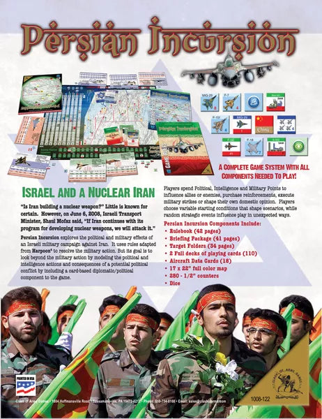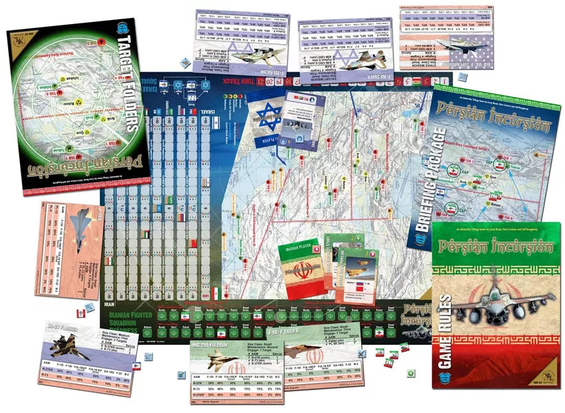 Persian Incursion explores the political and military effects of an Israeli military campaign against Iran. It uses rules adapted from Harpoon 4 to resolve the military action. But its goal is to look beyond the military action by modeling the political and intelligence actions and consequences of a potential political conflict by including a card-based diplomatic/political component to the game.