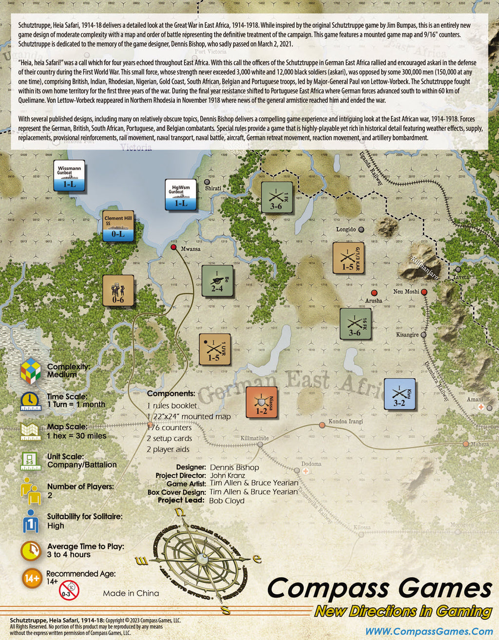 With more than 20 published designs including many on relatively obscure topics, Dennis Bishop delivers a compelling game experience and intriguing look at the East African Guerrilla war, 1914-1918. Forces represent the German, British, South African, Portuguese, and Belgian combatants. Special rules provide a game that is highly-playable yet rich in historical detail featuring weather effects, supply and supply depots, replacements, provisional reinforcements, rail movement, naval transport, naval battle, amphibious assault, aircraft, blockade runners, garrisons, German retreat movement, Allied ambush, infiltration movement, land and naval reaction, artillery bombardment, and more.