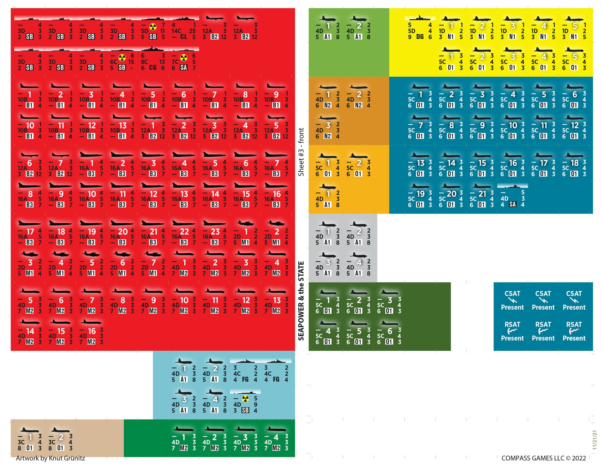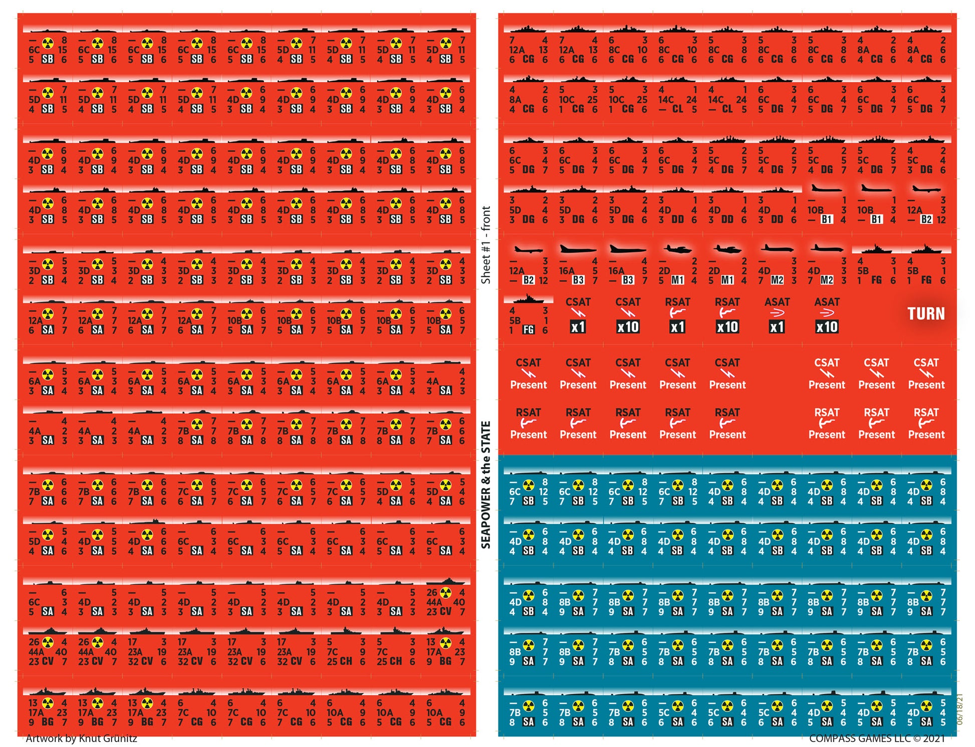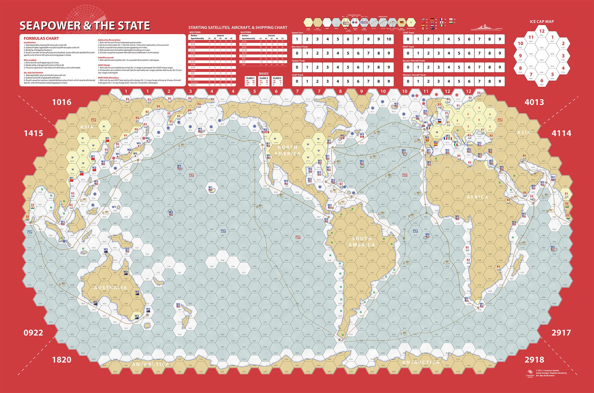 Seapower & The State examines this worldwide state of naval affairs as related to major conflicts in a two-player simulation game of high complexity on the grand strategic scale for the time period from about 1984-1994. Detailed systems depict the capabilities and liabilities of the aircraft, surface warships, and submarines of the period as individual platform types and in combined mutual support teams in the light of the expressed naval doctrines of the time. The game system covers various levels of conflict ranging from crisis atmosphere maneuvering with no actual combat through mutual strategic nuclear warfare strikes, including such aspects as:
